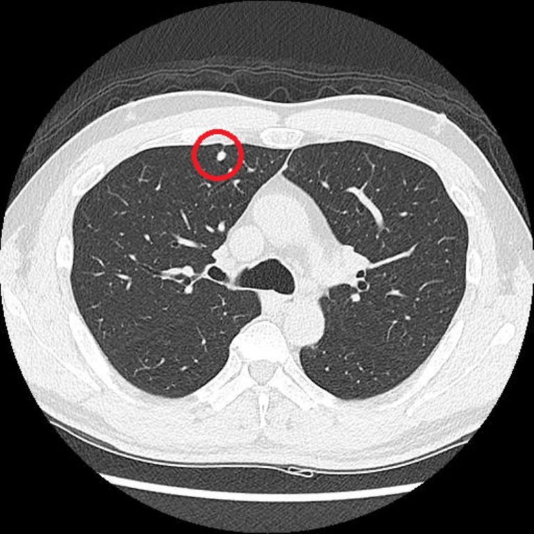 LDCT影像顯示,黃先生的右上肺處有一約0.5公分的結節,因無高度惡性特徵,僅需定期追蹤。