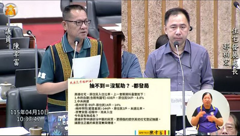 【記者于欽智高雄報導】高雄市議員陳幸富10日於公務部門業務質詢中為原住民族群發聲,爭取社會住宅居住權益,除提出詢問及建議外,並要求都發局等相關單位重視,盡速研議、改善!