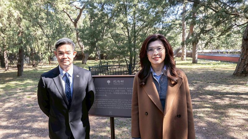 鄭麗文步出衣冠塚後,一行人駐足在院內一棵白皮松樹前,松樹是連戰前主席在2006年4月15日拜謁衣冠塚時所植,當年的小樹如今已高大參天。鄭麗文特別與同行的連戰次子、國民黨青年發展委員會主委連勝武在樹前合影留念,彰顯此次和平之旅的傳承意義。