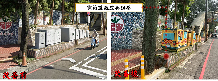 在工程內容方面,通學廊道改善除提升人行空間品質外,亦強化整體交通安全設計,包括行人穿越道退縮、設置行人庇護島、路口轉角擴大(街角擴大)、無障礙斜坡道優化等措施,有效降低人車衝突風險。同時透過鋪面改善與無障礙串聯設計,兼顧高齡者與行動不便者需求,逐步翻轉以往以車為主的道路型態,營造以人為本的街道環境。
