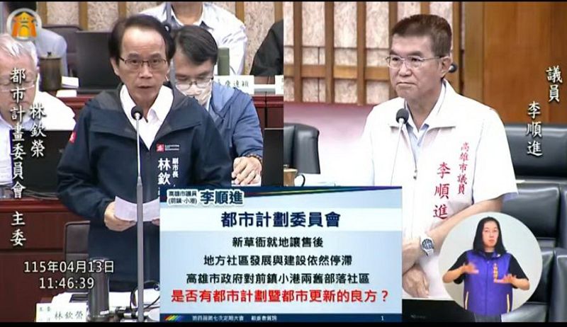 李順進議員指出,新草衙就地讓售後,地方社區發展與建設依然停滯,市府對前鎮、小港兩個舊部落社區,是否有都市計畫暨都市更新的良方?由於新舊草衙的發展,是亞灣區、205兵工廠發展的腹地及衛星,不要成為負擔。