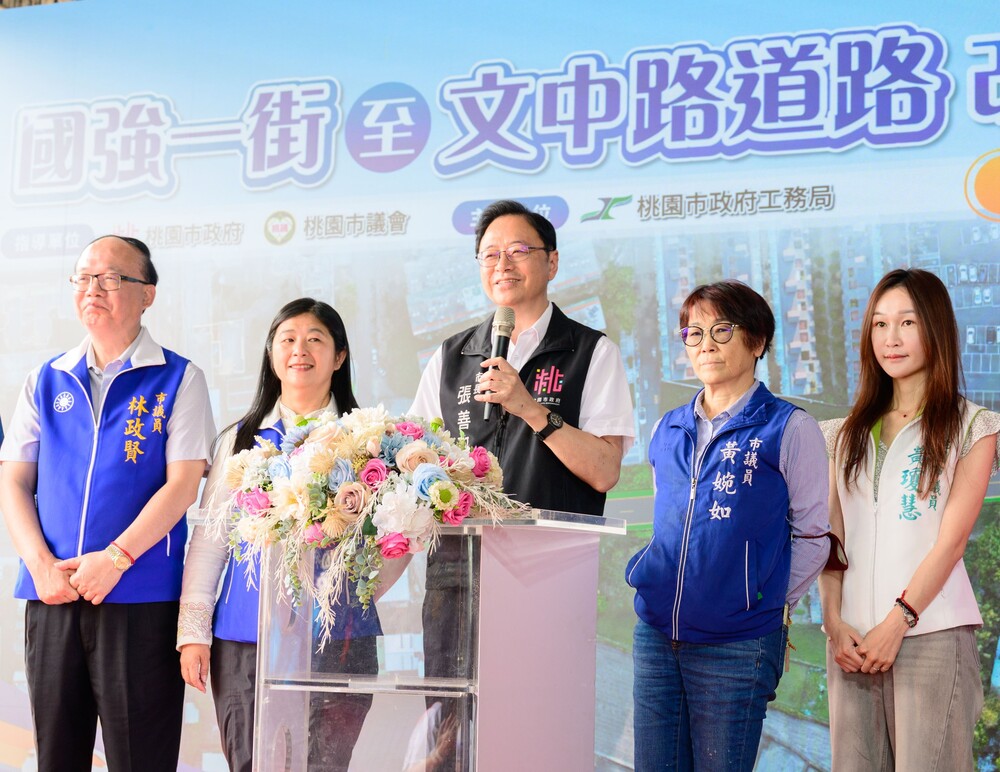【記者吳世傑桃園報導】桃園市長張善政14日上午在市議員黃婉如、林政賢、陳美梅、凌濤、張碩芳、李光達、黃家齊、黃瓊慧、市府工務局長汪在宙、桃園區副區長邱創正、佺葉工程顧問公司總經理陳少宏、遠城營造有限公司總經理陳世原等人陪同下,前往桃園區出席「桃園區國強一街至文中路道路開闢工程動土典禮」。