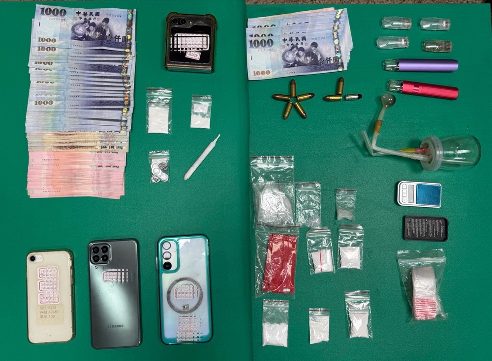 刑大偵六隊在去年九月間掌握,莫姓男子(五十八歲)、廖姓男子(四共歲)從事毒品交易,二人住處距離僅二百公尺,莫男在住處製造、分裝毒品,廖男則以住處作為「門市」分工,以傳統面交方式交易,吸引購毒者前往購買。警力搜索後查扣海洛因六包、安非他命三包、依托咪酯煙彈三顆、毒品分裝工具一組、子彈八發、手機及現金等等贓證物,毒品市價初估逾三萬元。