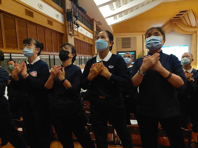 然而,承擔的背後仍有牽掛。先生長年在國外,獨居臺南的婆婆是她最放不下的心頭肉。為了讓長輩安心,她每隔一兩週便往返桃園與臺南,替婆婆採買備食。「婆婆歡喜,先生就安心,我也才能安心付出。」4月8日首次參與桃園區種子集訓時,長時間的跪姿與腳板貼地讓她備受考驗。自覺準備不足的她,甚至親手製作加厚護膝墊,只為穩穩走在承擔之路上。她的步伐或許不輕鬆,卻踏實篤定,這不僅是演繹的準備,更是一段生命與佛法相應的修行。