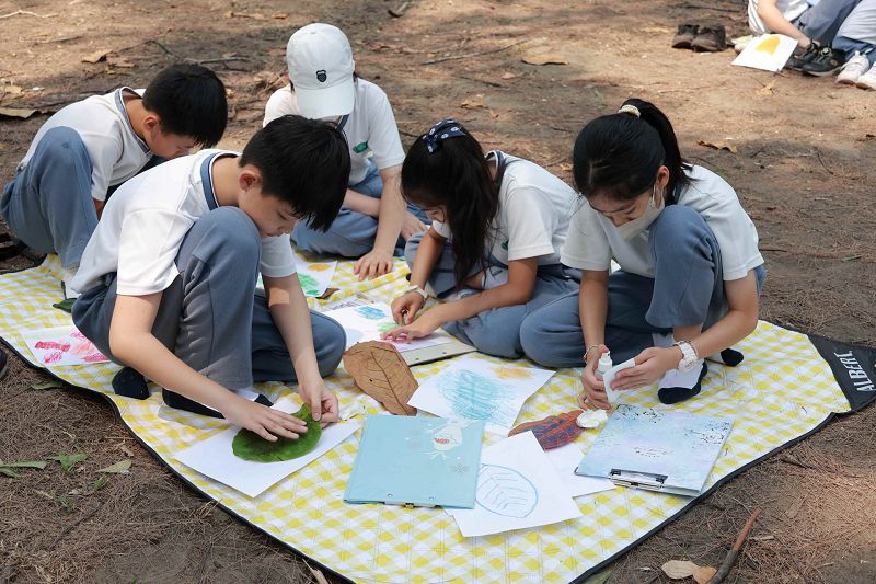 接著進行「創意葉子拓印」,孩子們撿拾落葉,用蠟筆將葉子的紋路印在紙上。四年感恩班子霈開心地說:「每一片葉子都不一樣,好像大自然在畫畫!」活動中特別提醒,只能撿地上的葉子,不可以摘樹上的葉子。孩子們在創作中學會「愛物惜福」,也懂得不破壞自然,就是對大地最好的尊重。