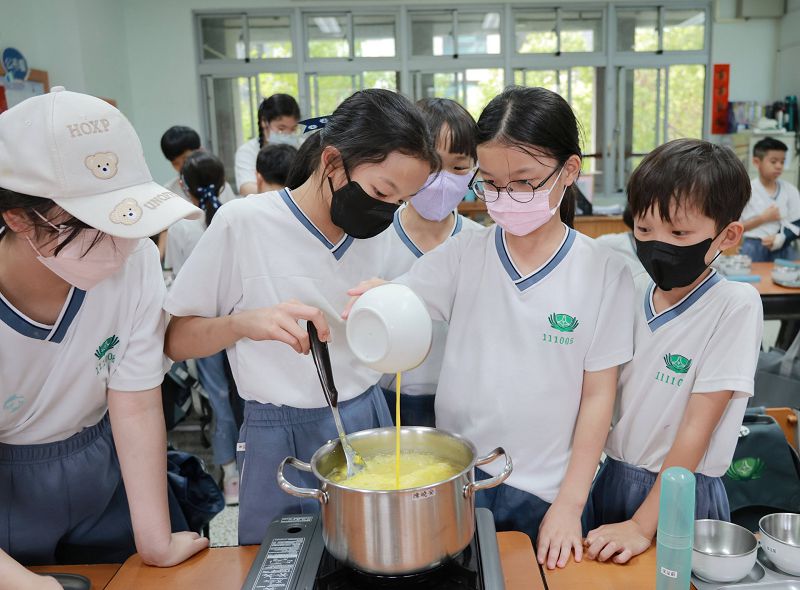 傍晚回到學校,「慈小大主廚」活動溫馨展開。孩子們分組煮玉米濃湯,從準備食材、打蛋、攪拌到完成,每一個步驟都需要合作。有的同學負責攪拌,有的提醒火候,有的幫忙整理環境。過程中,有人不小心把材料放錯,但同學沒有責怪,而是一起想辦法補救。慢慢地,一鍋香噴噴的濃湯完成了。當大家圍在一起喝湯時,臉上露出開心的笑容。孩子們發現,一起完成一件事,比一個人做更有成就感。也從中學會:食物得來不易,要心存感恩,不浪費每一份資源。