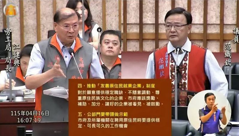 高雄市議員范織欽於議會社政部門業務質詢議程中,為原住民族群勞工的穩定就業權發聲,要求強化勞動契約落實與稽查、建立不當調動的申訴與審查機制、針對高風險產業加強勞檢,推動友善原住民就業制度,並由公部門帶頭示範;另又建議敬老卡應檢討計程車合作機制,提升可用車輛比例,為偏鄉與原住民設計專屬使用方式,重新評估點數額度、簡化使用流程,讓長者一看就懂、一用就會。(圖文:記者于欽智)