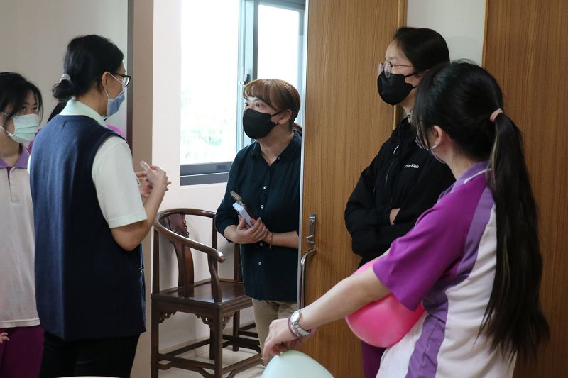 臺中市立仁愛綜合長照機構主任陳秋珍親自接待來訪師生,透過簡報介紹機構的經營理念、軟硬體設施及職涯發展路徑。簡報結束後,學生分成兩組,分別到日間照顧中心與住宿區,帶領長輩進行傳球互動遊戲,藉此訓練長輩的手眼協調與認知功能。活動過程中,學生在旁陪伴,與長輩熱絡互動。