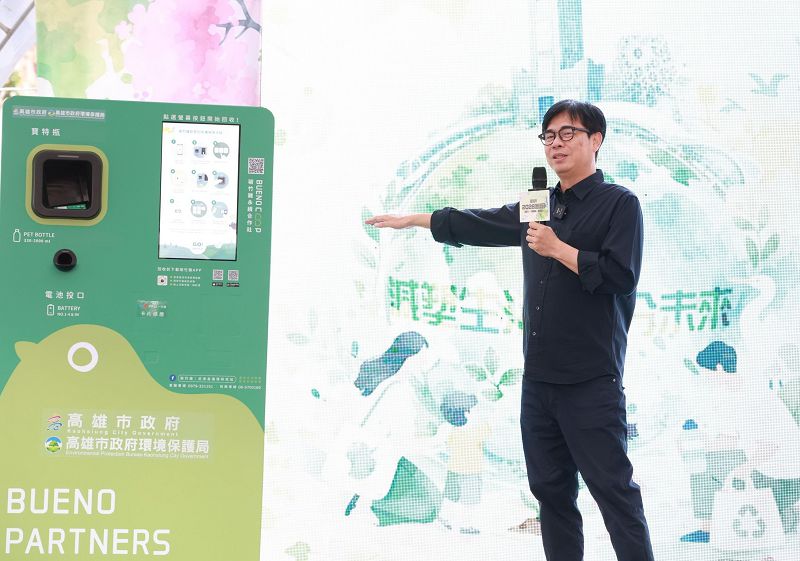 陳其邁並示範將寶特瓶,依序投入自動資源回收機(ARM),並以生動方式介紹其操作模式,投入5個塑膠空瓶,即可獲得一卡通加值1元。他也說,自動資源回收機已建置在全市27個行政區,共190台,建置率約達71%。而每年回收機約可回收400多萬支寶特瓶,鼓勵大眾多加使用,一起動手做環保。