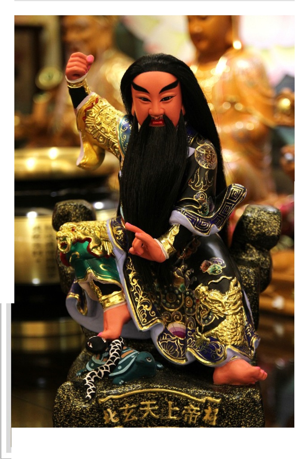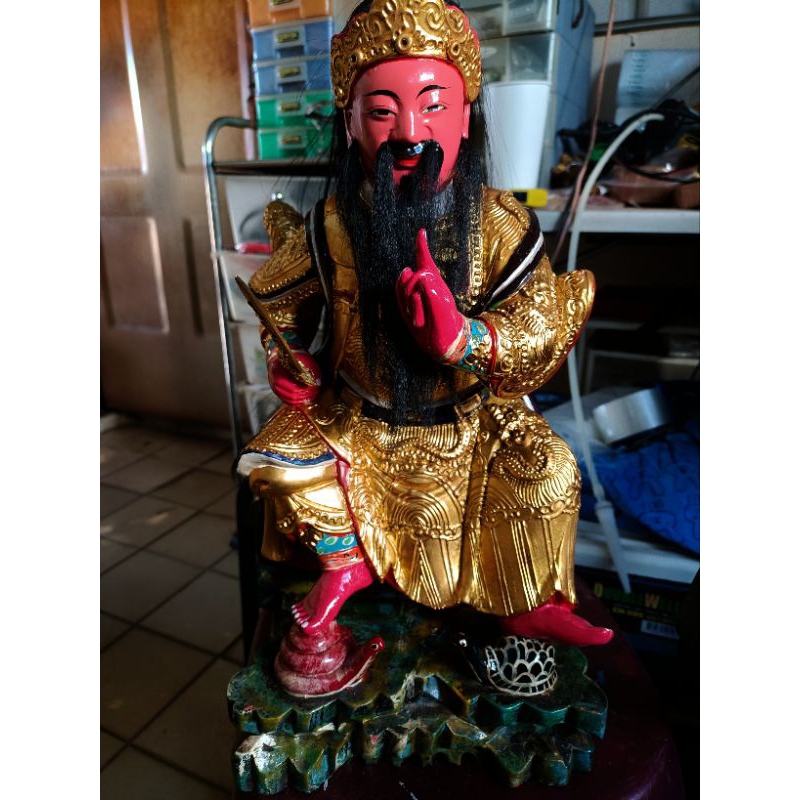 在民間信仰中,玄天上帝又被稱為上帝公、帝爺公、北極玄天上帝,是極具代表性的護國、鎮煞之神。祂的形象威嚴肅穆,常見黑面、披髮、手持七星劍,展現出斬妖伏魔、護佑眾生的神威。對許多信眾而言,玄天上帝不只是武神,更是守護家宅、驅邪避煞、安定人心的重要神明。而祂腳下所踩的龜蛇,正是玄天上帝神像最具辨識度的象徵之一。民間一般稱為「龜蛇二將」或「龜蛇將軍」,也有人視其為玄武化身的一部分。在傳說脈絡裡,龜與蛇原本帶有陰濁、混沌、邪祟未除的意涵,最終在玄天上帝修行得道、降伏妖邪的過程中被收伏,成為神威的見證。也因此,「腳踩龜蛇」並不是單純的裝飾,而是象徵玄天上帝已能制伏邪煞、鎮守四方。