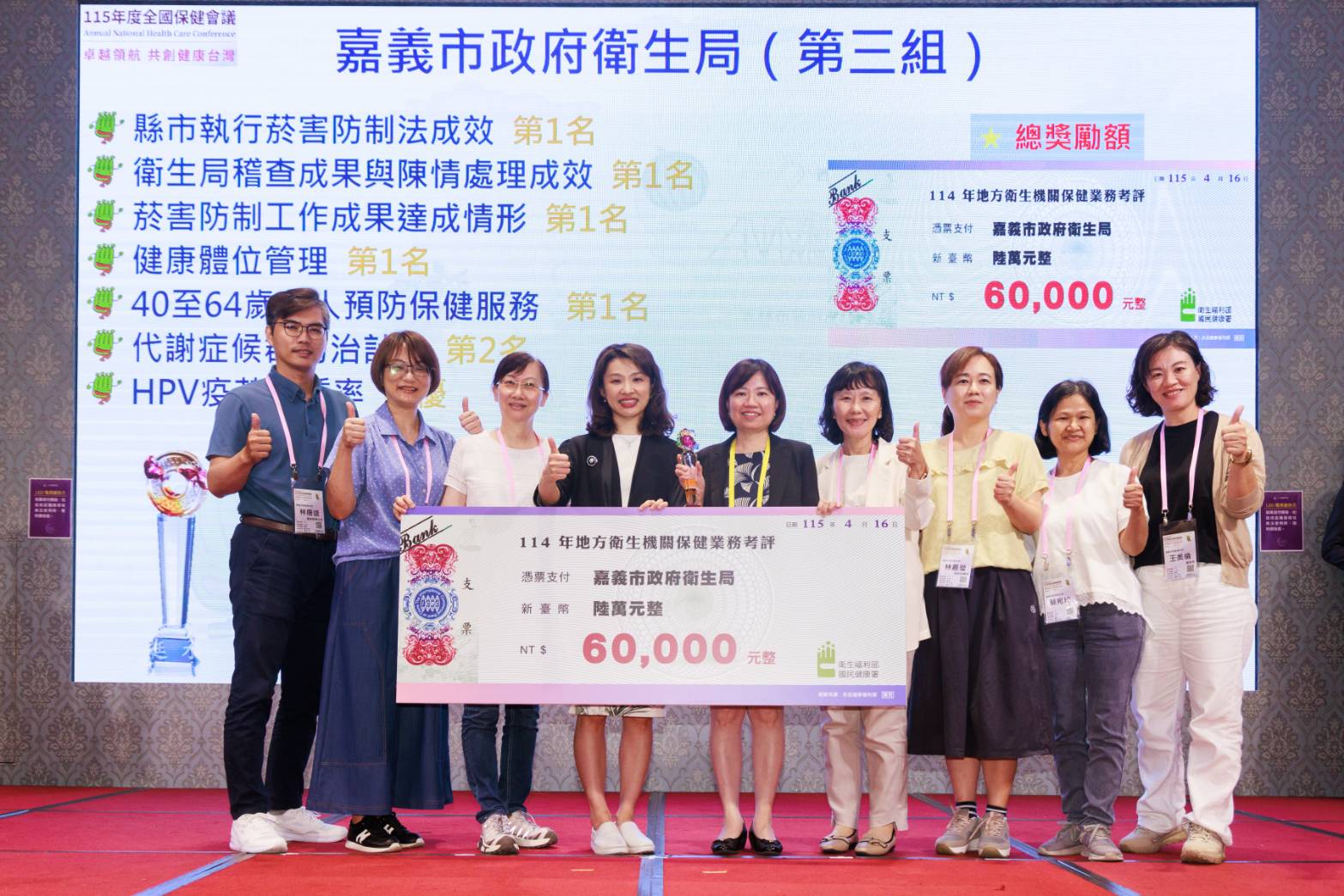 本次頒獎典禮由衛生福利部國民健康署沈靜芬署長親自頒獎,表揚全國各縣市於114年度推動保健業務的優異表現。嘉義市政府衛生局在多項評比中脫穎而出,包括菸害防制法執行成效、網路監測案件辦理、稽查與陳情處理績效、健康體位管理、40至64歲成人預防保健服務、代謝症候群防治計畫,以及HPV疫苗接種率等面向,均獲高度肯定,成績斐然。