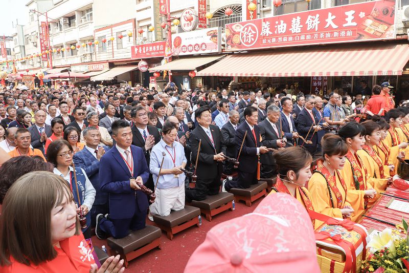 【記者謝敏政嘉義報導】年度宗教盛事大甲媽4月17日起駕,展開九天八夜繞境,20日晚抵達嘉義新港鄉奉天宮,21日上午舉行重頭戲「媽祖祝壽大典」,上萬名信徒一同守候在奉天宮周邊,共同進行祝禱儀式,嘉義縣長翁章梁、大甲鎮瀾宮董事長顏清標、奉天宮董事長何達煌等人率眾人膜拜,場面莊嚴。