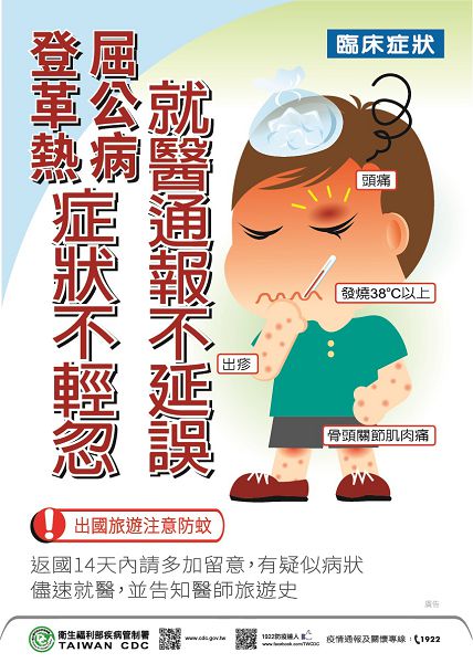 嘉義市政府衛生局呼籲民眾若發現疑似登革熱相關症狀,如發燒、頭痛、後眼窩痛、肌肉痛、關節痛、出疹等,應儘速就醫並告知旅遊史及活動史,以爭取防治的黃金時間。民眾如果確診登革熱,請不要慌張,儘量在家休息減少外出,並配合衛生局疫情調查,請巡視家中紗窗是否有破損,睡覺時要掛蚊帳,遵照醫師指示服藥、多喝水。嘉義市共有40家登革熱快篩醫療合作院所,如需相關資訊,請參閱嘉義市政府衛生局網頁/登革熱專區/醫療訊息或電洽衛生局05-2338066轉疾管科。
