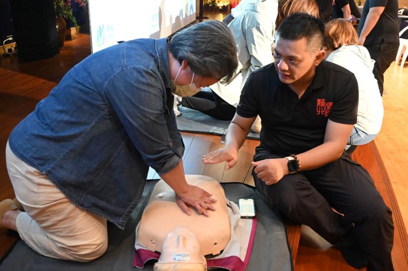 「術科實作演練,與死神搶時間的急救技術。」下午的實作課程轉入高度緊張的術科操作。唐健清教官在指導心肺復甦術(CPR)與自動體外心臟電擊去顫器(AED)操作時嚴肅指出:「正確的急救動作是在跟死神搶時間。」他透過多起實際案例,強調在重大災難發生的黃金救援時間內,若有具備專業技能的防災士介入,將能大幅提升生還率,並協助後續醫療人員精準接手。