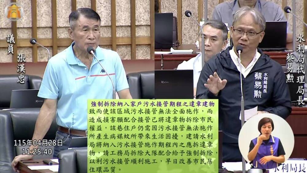 高雄市議員張漢忠於議會農林部門業務質詢中,先針對強制拆除納入家戶接管期程之違章建物議題指出,高雄污水接管率50.85%,針對用戶後巷雙邊排水施作寬度不足問題,仍有部分用戶不願配合拆除違章建物,影響污水接管施作進度以及孳生病媒蚊困擾,建議強制拆除以加速施工提升接管率。水利局代局長長蔡易勳表示,114年全市接管逾22700戶,鳳山區後巷違建共109戶,協調後106戶願意自拆,僅3件強制拆除。有關農耕地運送土壤需申請許可問題,張議員指出,部分農民不懂法律,購入未申請許可土方導致違法,盼裁量比例給予勸導替代罰鍰。農業局長姚志旺答覆會研議考量。(圖文:記者于欽智)