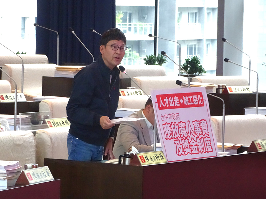 【記者蘇永欽台中報導】台中市面臨公務員人才流失與缺工惡化問題,已逐漸影響市政推動品質。市議員林祈烽30日在議會質詢中指出,市政府基層人力嚴重失衡、勞逸不均,應放寬人事費與獎金制度,以激勵現職員工,並降低其壓力。