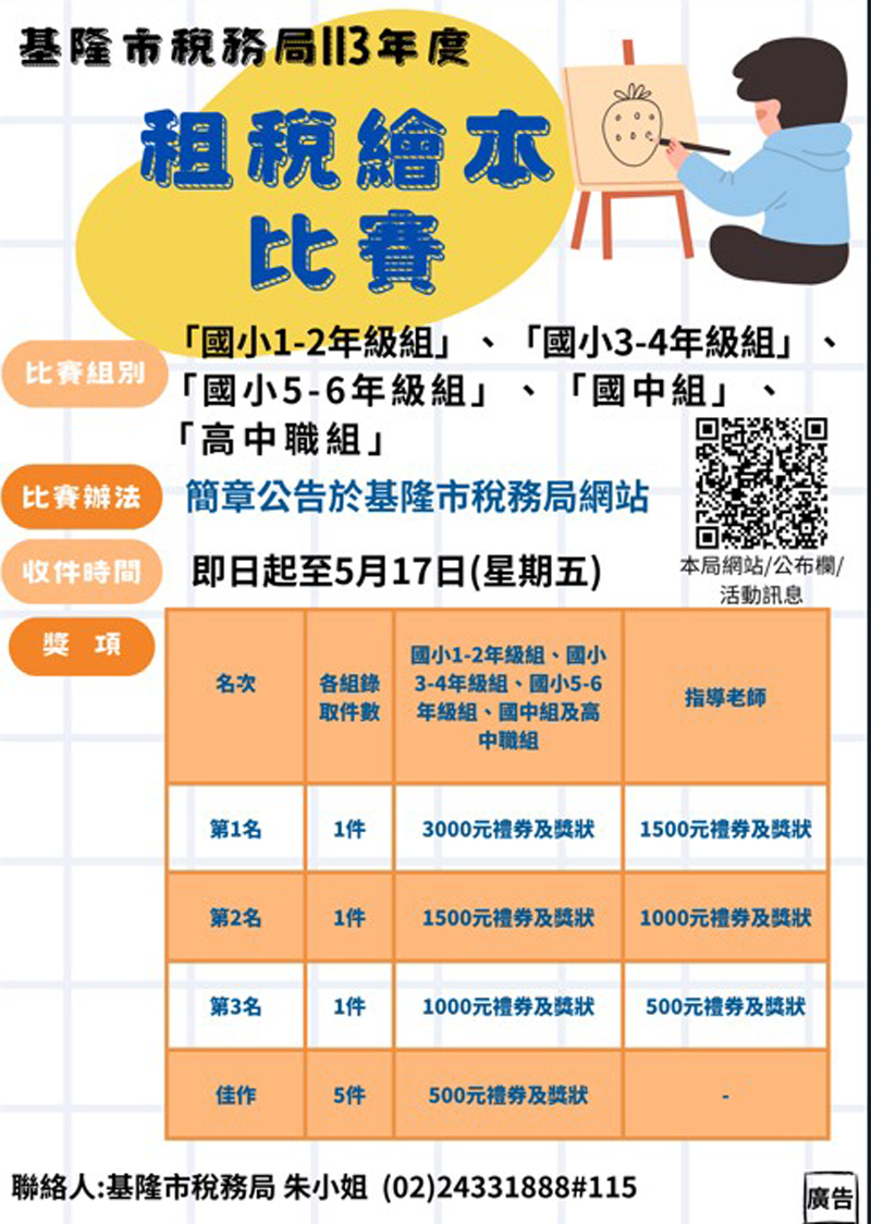 【記者張毅基隆報導】基市稅務局為加強推行學校租稅教育,宣導購物消費使用載具儲存雲端發票,以及行動支付結合雲端發票等觀念,藉由辦理「結合統一發票推行辦理學生租稅繪本比賽活動」,活動自即日起到五月十 繼續閱讀