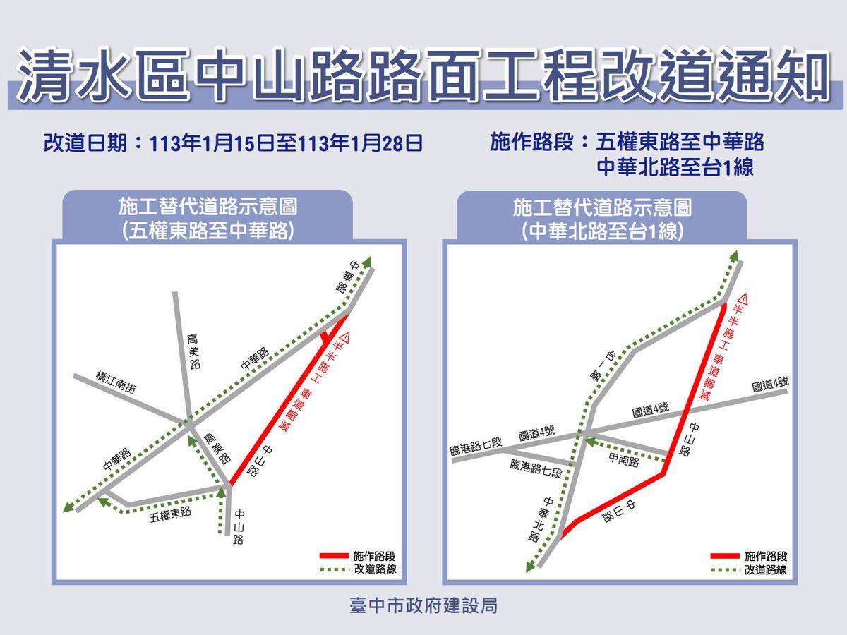 中市清水中山路第二階段燙平提醒用路人提前改道