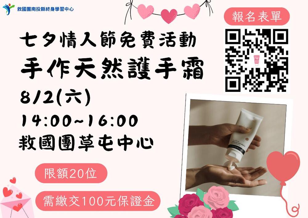 【記者陳良安南投報導】為了慶祝即將來臨的七夕情人節,救國團南投縣終身學習中心將於114年8月2日在草屯中心舉辦「手作天然護手霜活動」。我們誠摯邀請所有情侶、朋友及家庭成員共同參與,透過此次活動享 繼續閱讀