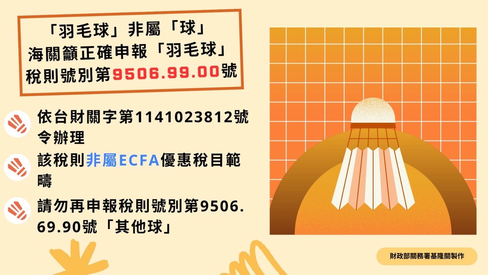 進口「羽毛球」稅則歸列改變 基隆關提醒業者留意