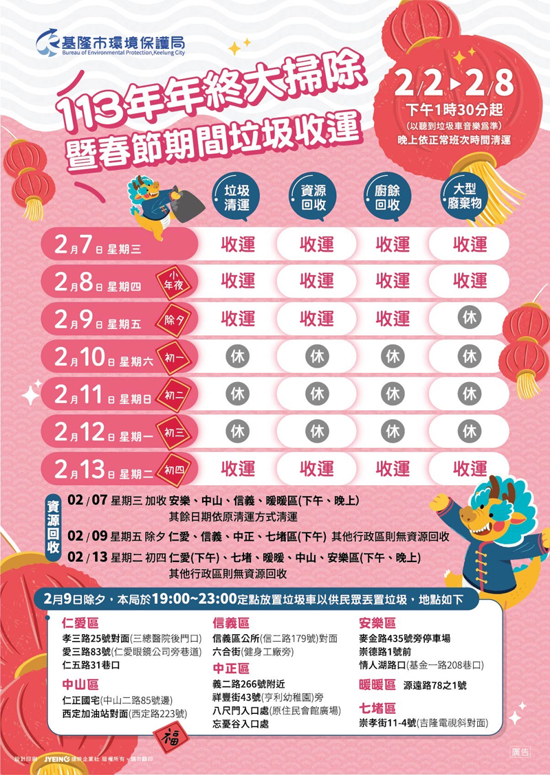 除夕日晚上6時後 初一至初三停止收運垃圾 【記者張靜惠基隆報導】農曆春節即將到來,基隆市環境保護局呼籲民眾提前開始除舊布新大掃除,2月2日至2月8日實施年終大掃除,期間2月4日例假暫停收運外,仁 繼續閱讀