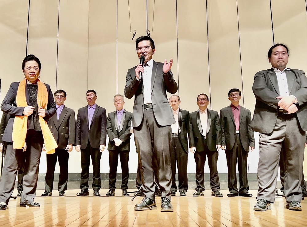 圖:前排左陳美香指揮,中為團長徐仁斌右名助理指揮鍾季霖。後排為團員(圖一);啄木鳥資深團長鄭志中(中)賢伉儷,早先到埸受到團長徐仁斌的熱烈歡迎(圖二)。(記者李伯元攝)