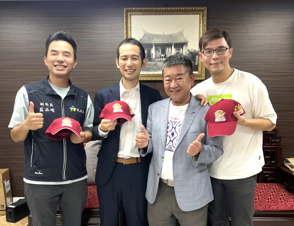 圖1:樂天桃猿隊勇奪 2025 年中華職棒總冠軍,奪下隊史第 8 座總冠軍、領隊牧野幸輝(左二)在民政局副局長藍品畯(左一)、體育局長許彥輝(右一)等市府人員陪同下,前往桃園慈護宮還願並報告奪冠佳績,感謝媽祖一路庇佑,由慈護宮主委簡征潭(右二)親自率員熱誠接待。