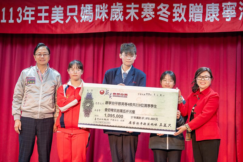 桃園市長張善政(左一)與啟英高中媽咪王美只(右一)頒發獎助學金鼓勵孩子們。