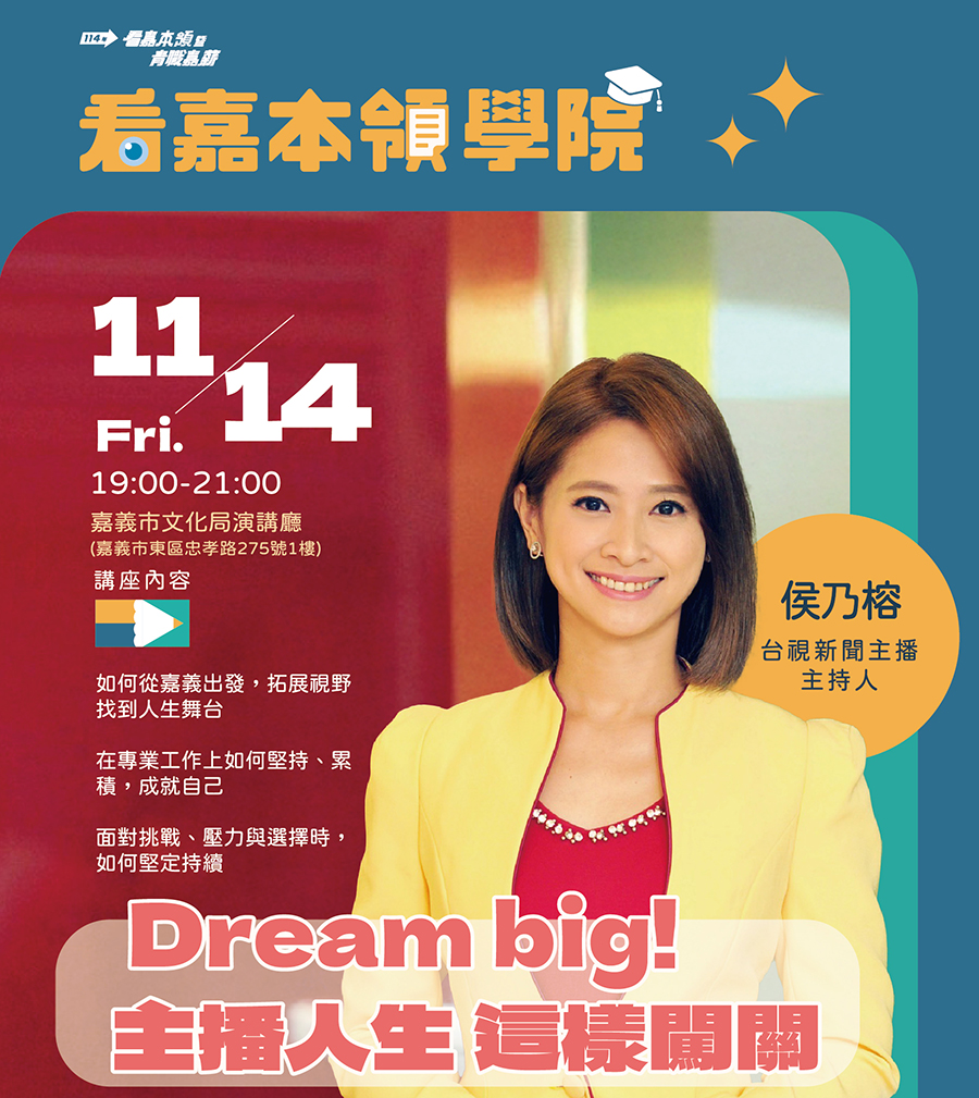 【記者張朝福嘉義報導】為深化青年職涯發展、協助青年探索自我定位與未來方向,嘉義市政府將於11月14日(五)晚上7點在嘉義市文化局演講廳舉辦「看嘉本領職涯講座」名人系列之一,特別邀請到出身嘉義、現 繼續閱讀