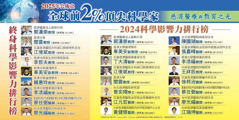 史丹佛大學最新公布的「全球前2%頂尖科學家 World’s Top 2% Scientists」資料庫中,慈濟醫療志業與慈濟大學展現驚人的學術成長力,2024年共有16位學者入選,創 繼續閱讀